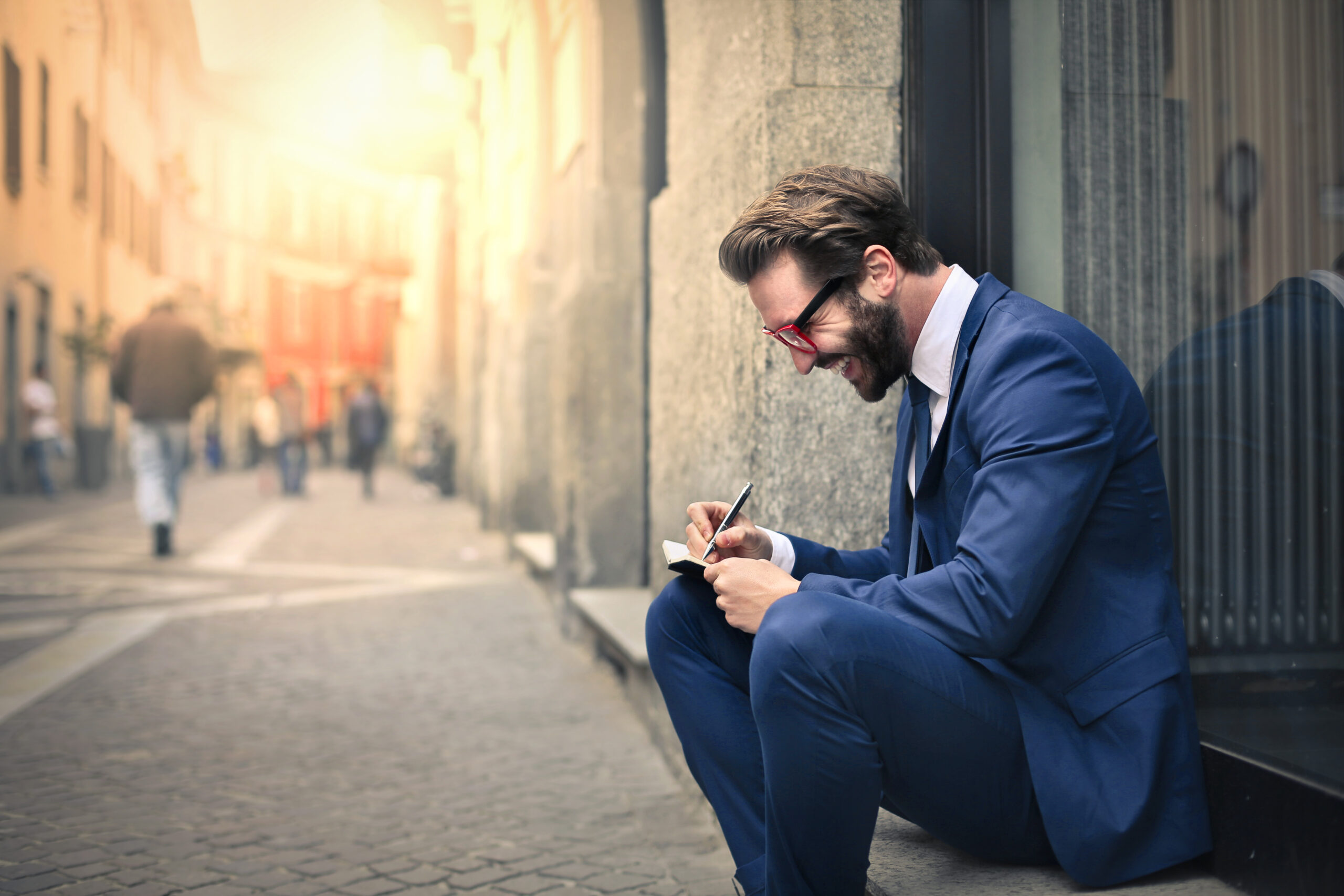Joyful businessman writing in the street